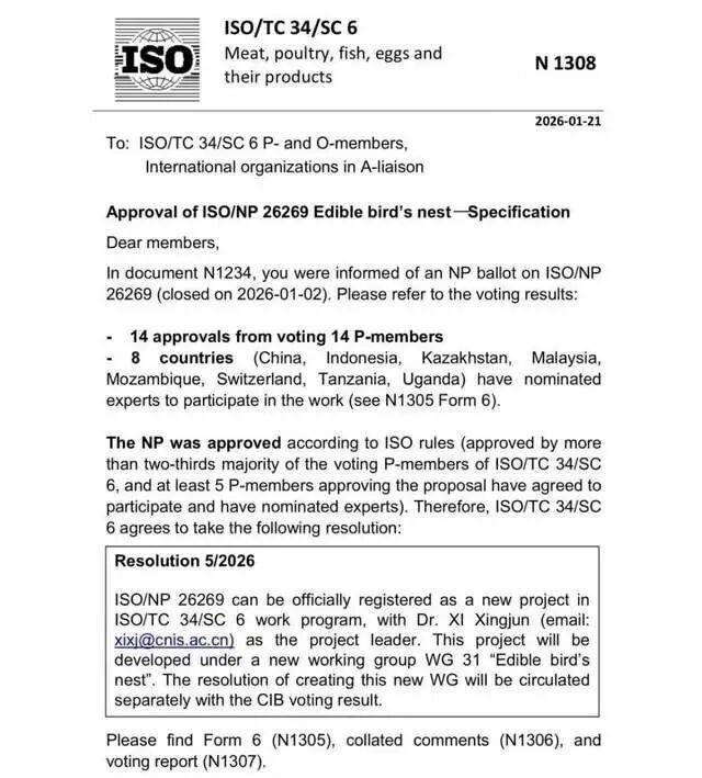 2026年1月21日,燕之屋结合中国尺度化研究院从导制定的国际尺度《Edible birds nest — Specification 》(ISO/AWI 26269)成功获得国际尺度化组织(ISO)立项,标记着中国企业正在特色食物国际法则制定方面取得了汗青性冲破。